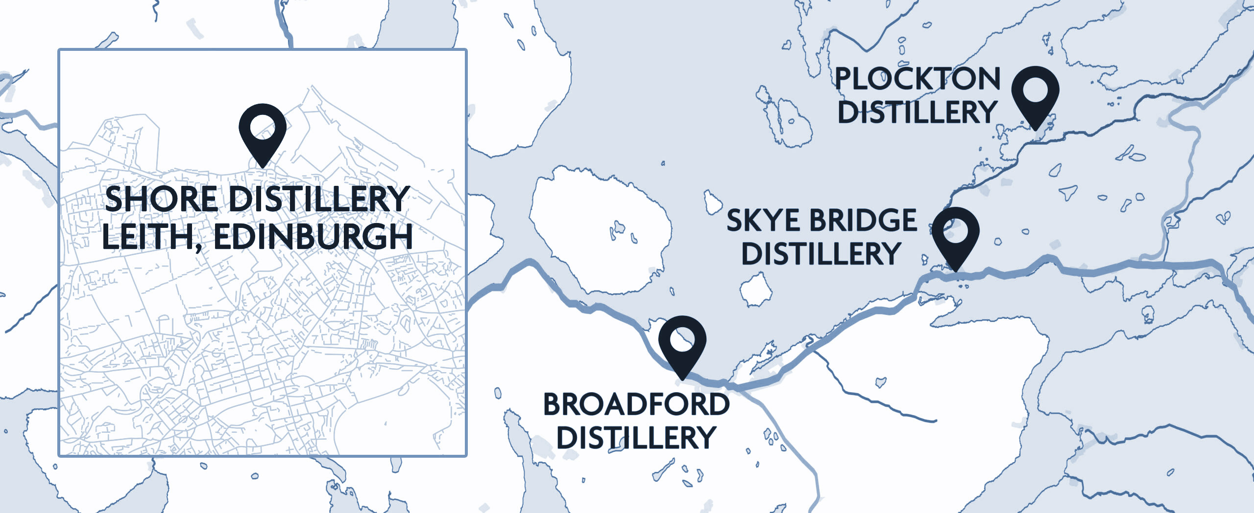 Discover the heart of our craft through our four unique distilleries. Broadford Distillery, rooted in tradition in the bustling heart of Skye; Skye Bridge Distillery, standing proudly at the gateway to the island; Plockton Distillery, nestled in a charming coastal village on the mainland; and the Shore Distillery, in Leith, Edinburgh, bringing the Highlands and the Isle of Skye to the city. Each location brings its own character, landscape, and story to the spirits we create.